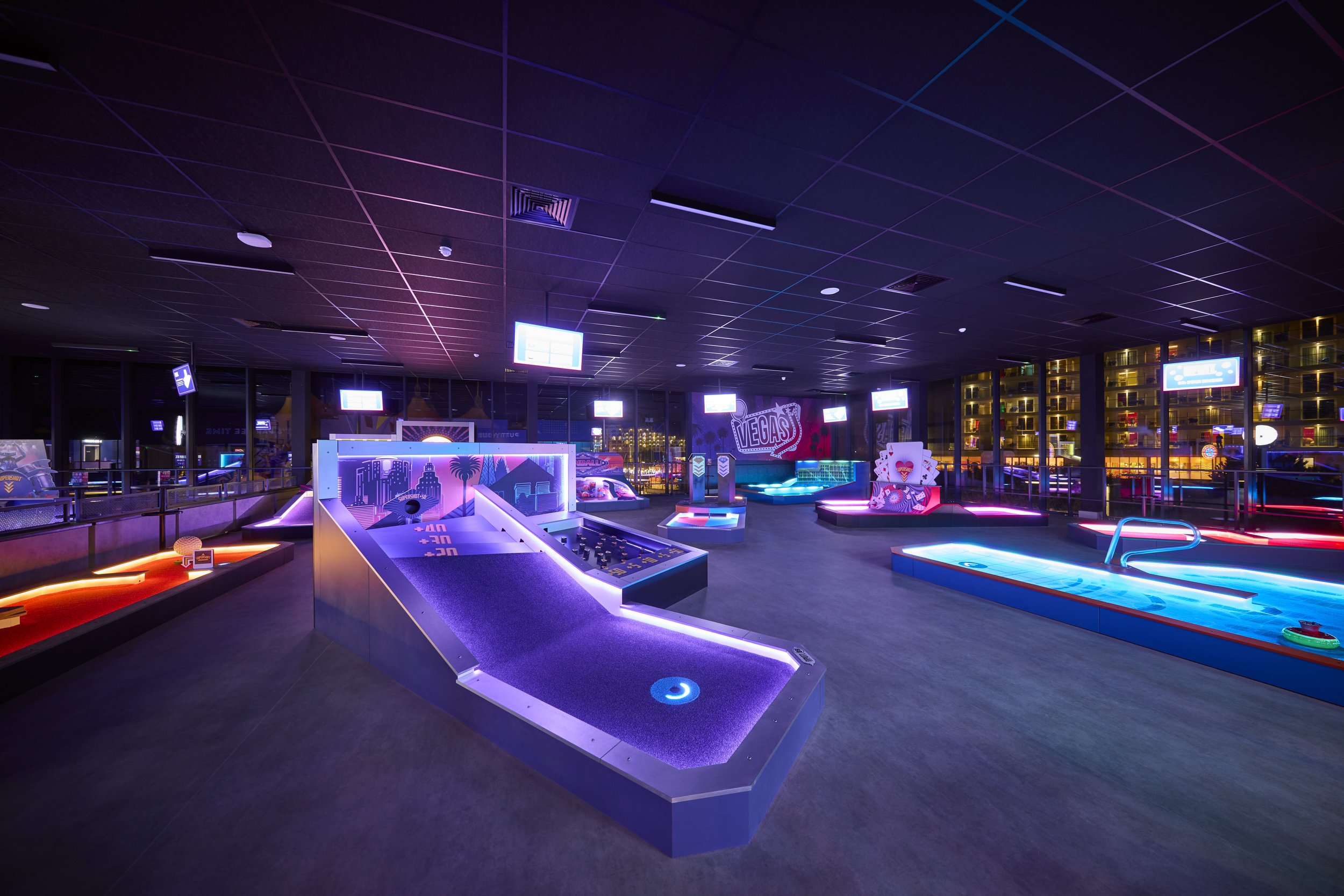 Multiple sensors around the course provide a highly immersive and interactive experience through carefully designed theming, lighting, special effects and gamification. Players must hit prize-winning SuperShots or avoid the penalties of potential traps! Instead of just collecting stroke count, guests can also compete by earning points.